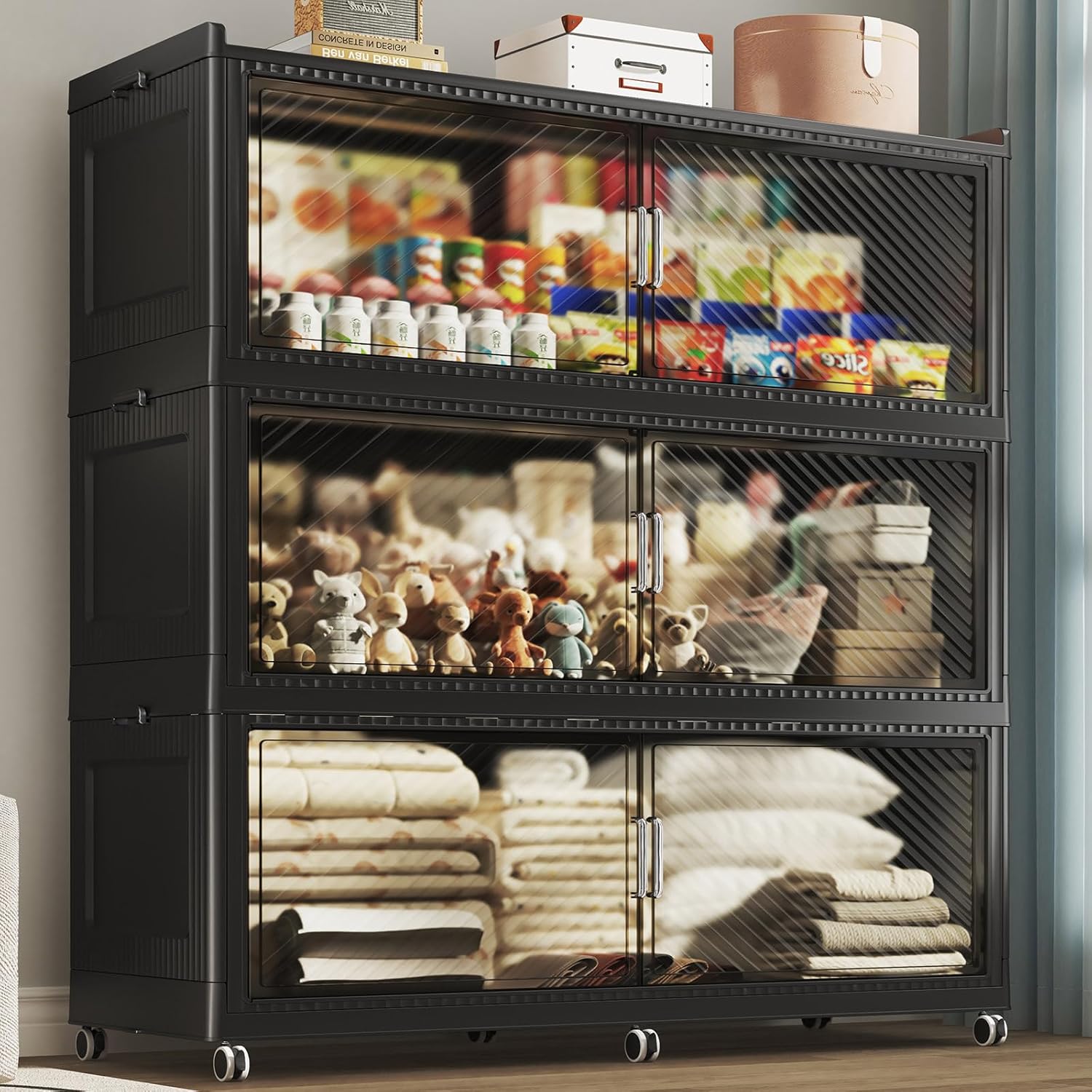- 【Two Ways to Open & Magnetic Doors】The collapsible storage bins with lids and wheels feature a dual access way, allowing for both top and front door openings, and with clear brown windows for easy visibility. The super huge storage bins with open front doors are equipped with magnetic lock buckles to prevent dust from entering the cabinet.