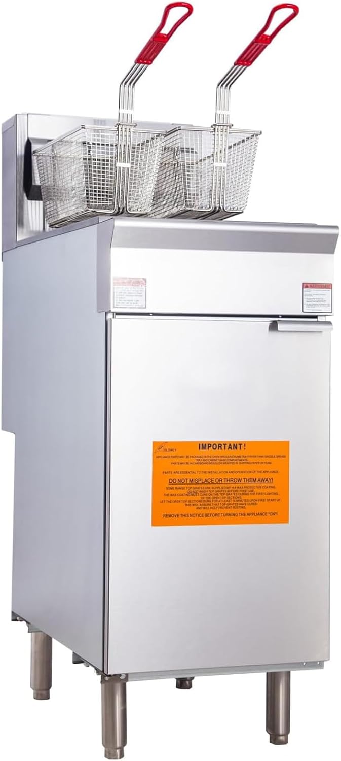- Large Capacity - With overall dimensions of 30.12" x 15.57" x 45.75"(LxWxH) and a generous oil tank capacity of 45 - 55 pounds, this commercial liquid propane/natural gas fryer offers substantial cooking space. The smooth surface of the fryer, detachable basket hooks, and a drainage valve make cleaning and maintenance a breeze.