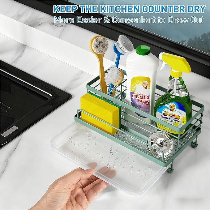 Cisily Sage Green Sponge Holder for Kitchen, Sink Caddy Sink Organizer Rack for Kitchen Accessories with Drip Tray, Rustproof and Non-slip, Soap Dispenser Countertop Organizer Essentials for New Home