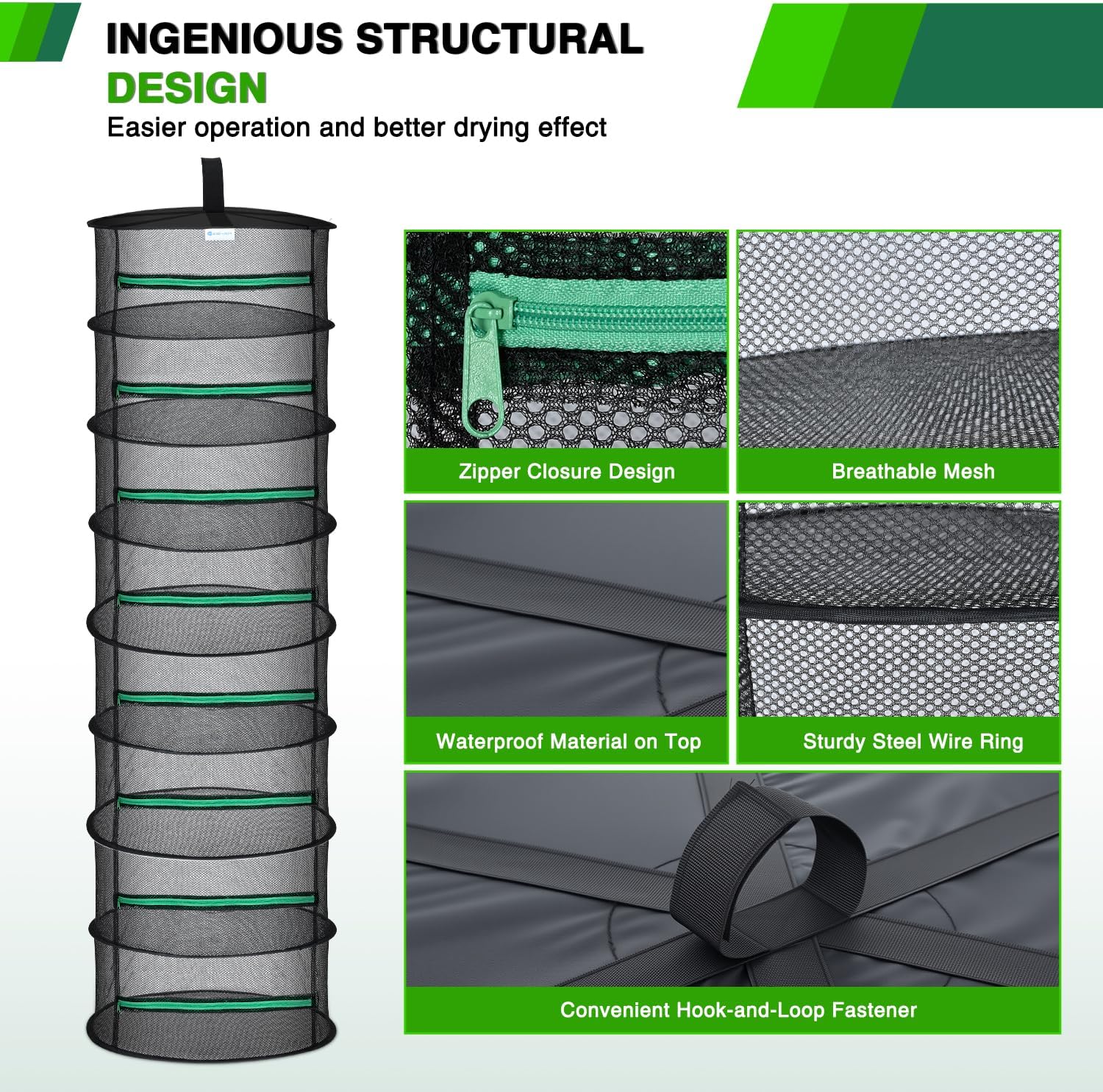 - AVAILABLE IN VARIOUS SIZES: The herb dryer hanging rack is available in 4-layer, 6-layer, 8-layer and 3 colors. This plant drying rack is 8-layer, 23.6" in diameter, each grid is 7.5" high, and 60" in total height when unfolded, fits 3x3 or Larger Grow Tents. The multi-layer separated drying net ensures optimal airflow between the trays, thereby achieving faster and more even drying. It provides ample space for flower buds and food to meet all your drying needs. Due to the elasticity of the mesh, slight size variations may occur
