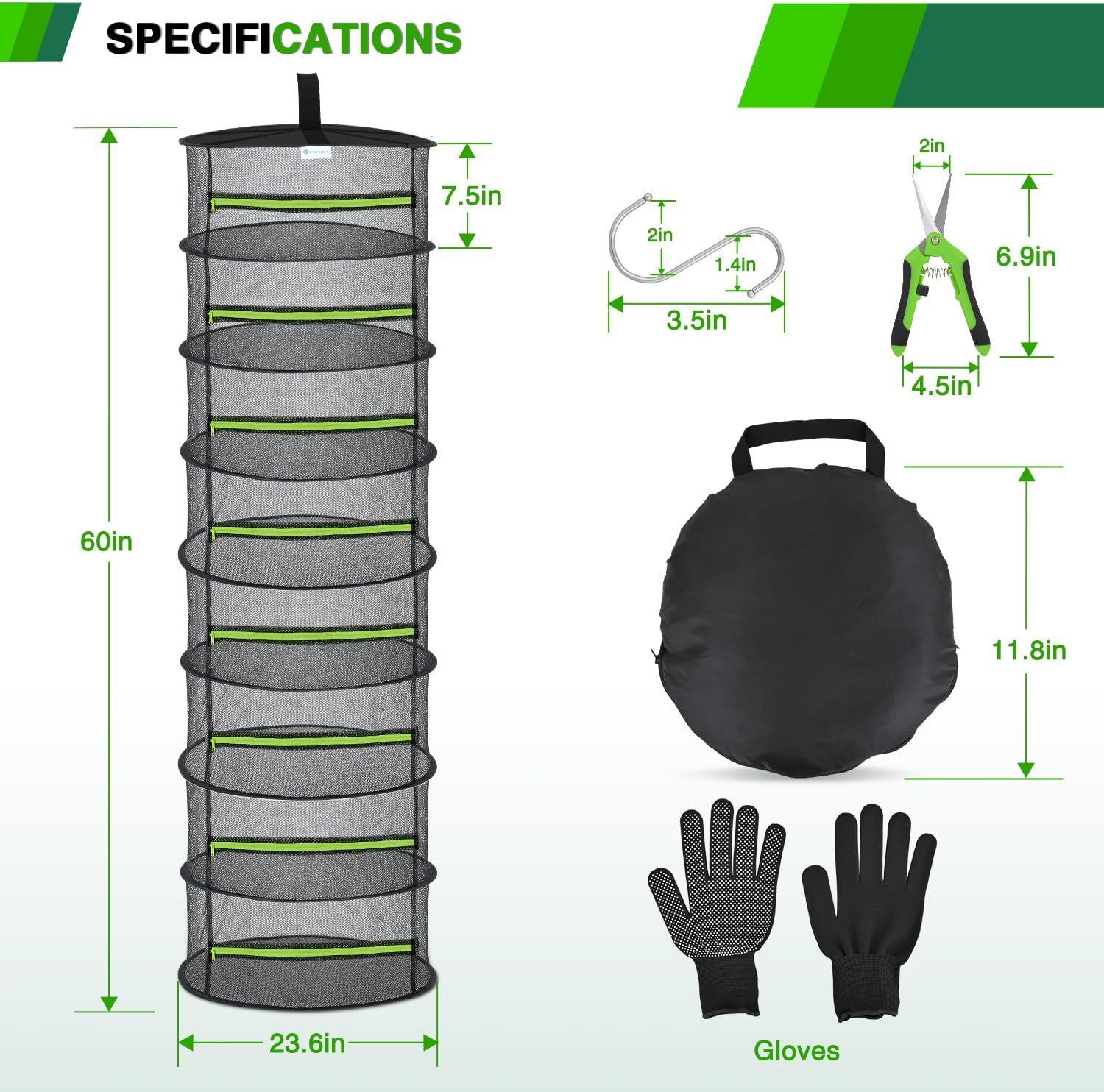 - AVAILABLE IN VARIOUS SIZES: The herb dryer hanging rack is available in 4-layer, 6-layer, 8-layer and 3 colors. This plant drying rack is 8-layer, 23.6" in diameter, each grid is 7.5" high, and 60" in total height when unfolded, fits 3x3 or Larger Grow Tents. The multi-layer separated drying net ensures optimal airflow between the trays, thereby achieving faster and more even drying. It provides ample space for flower buds and food to meet all your drying needs. Due to the elasticity of the mesh, slight size variations may occur
