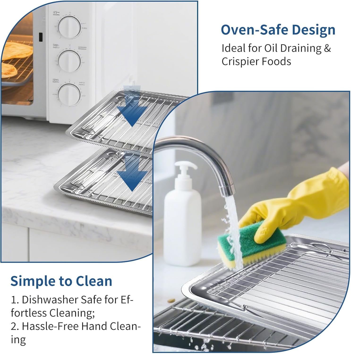 - 【Durable Stainless Steel】Crafted from food-grade stainless steel, this 16×12×1 inch set resists rust and warping, even after repeated use in ovens up to 500°F. Thickened base ensures even heat distribution—no more burnt cookie edges or undercooked meats. Built to last few years, looking like new with every use.