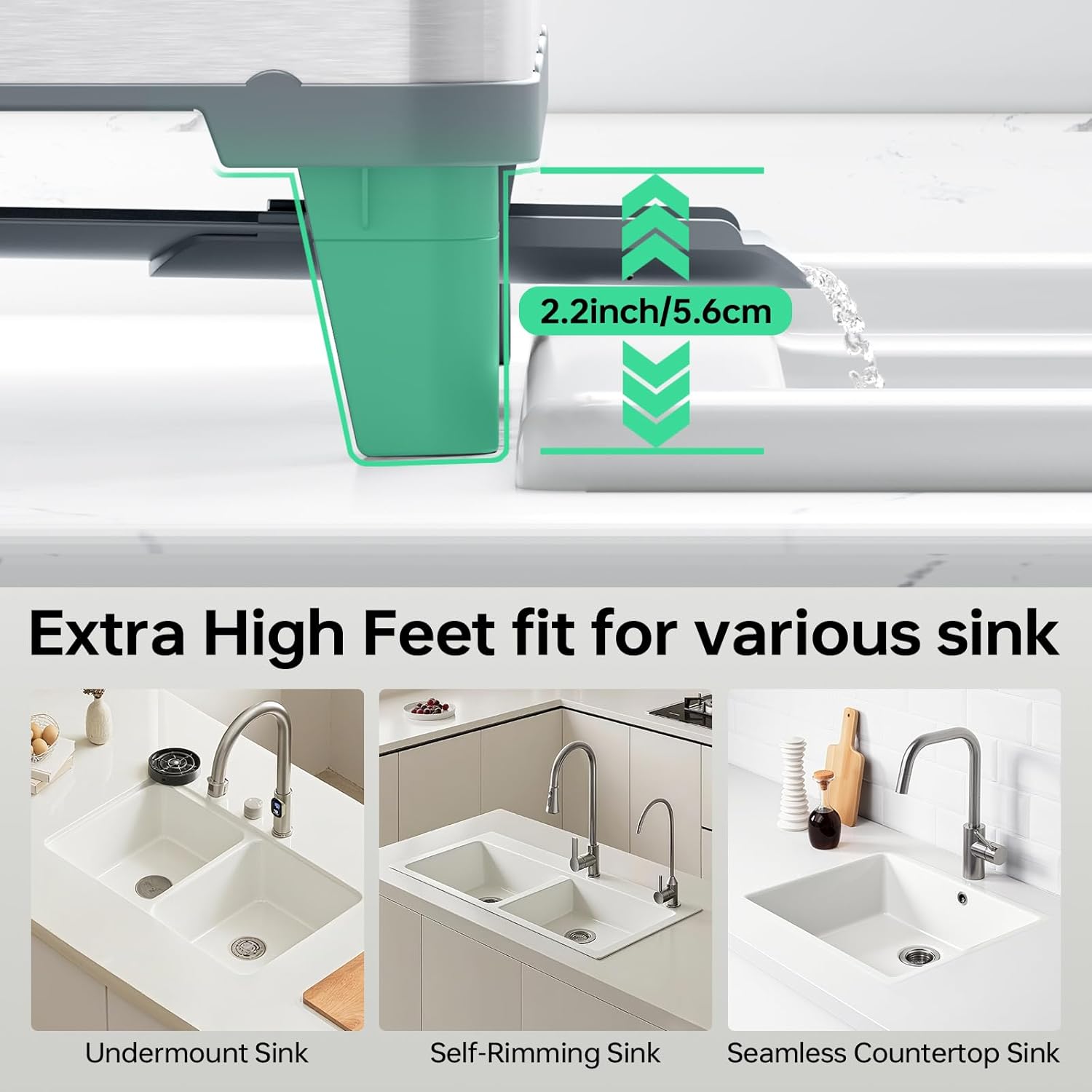 - [8 Feet Stable Support] The extra large dish rack features 8 sturdy legs that evenly distribute weight, preventing tipping and ensuring stability. Additionally, The heighten feet made the expandable dish drying rack perfectly suitable for various sink types (Undermount Sink, Self-Rimming Sink, Seamless, Countertop Sink).Moreover, the height allows water to flow smoothly into the sink, keeping the kitchen dry, tidy, and practical