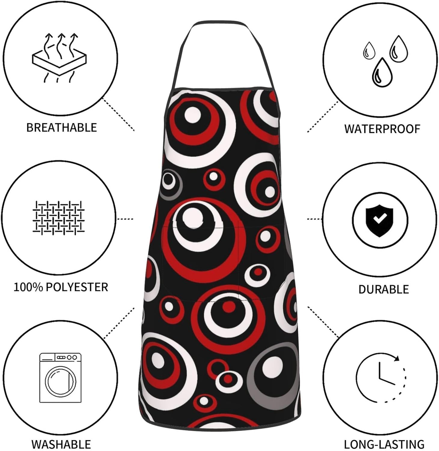 - Material: Made of high quality polyester, this retro red and black circle chef kitchen apron is durable, breathable, and waterproof, providing excellent protection for your clothes while cooking, grilling, baking, or engaging in other messy tasks