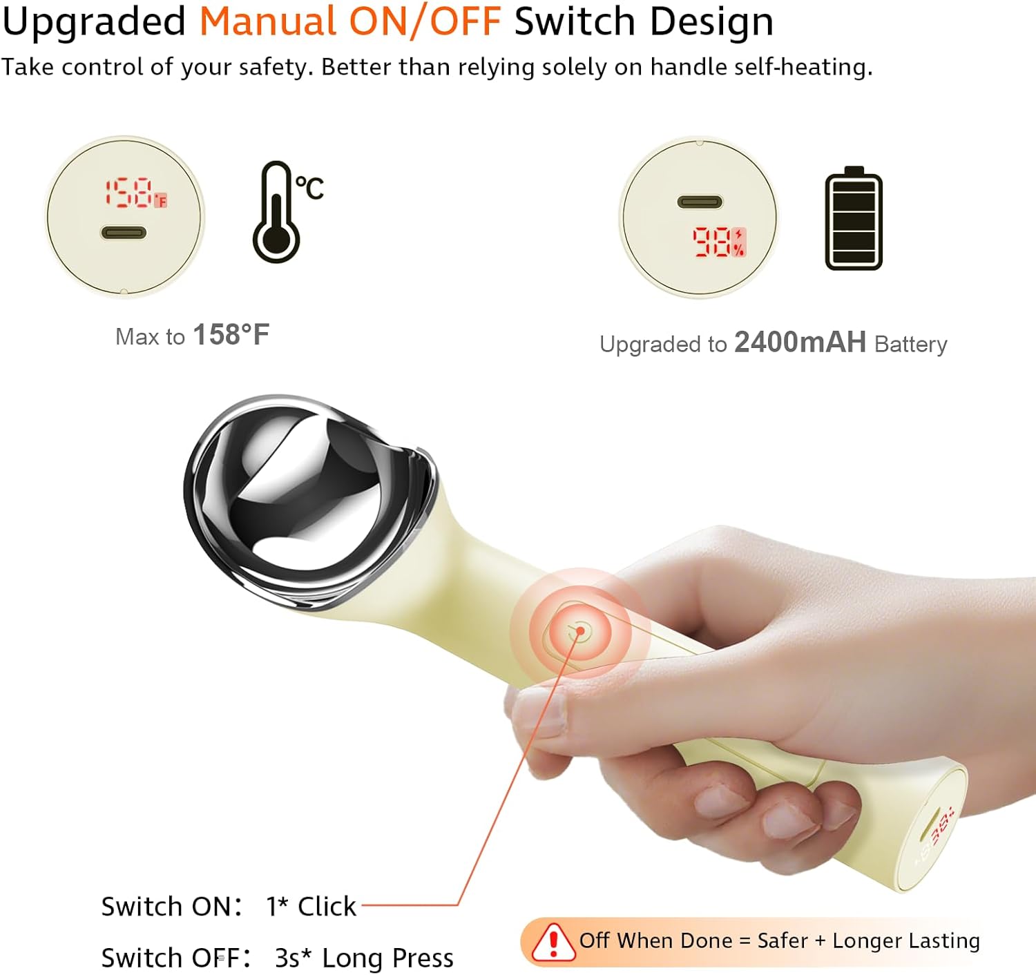 - 【Effortlessly Scoop Rock-Hard Ice Cream in Seconds】Simply grip the heated ice cream scoop rechargeable, letting the scoop to an ideal temperature. Glide through frozen-solid ice cream, gelato, or yogurt straight from the freezer for perfect, round scoops every time—no more waiting for it to thaw or struggling with a bent spoon.