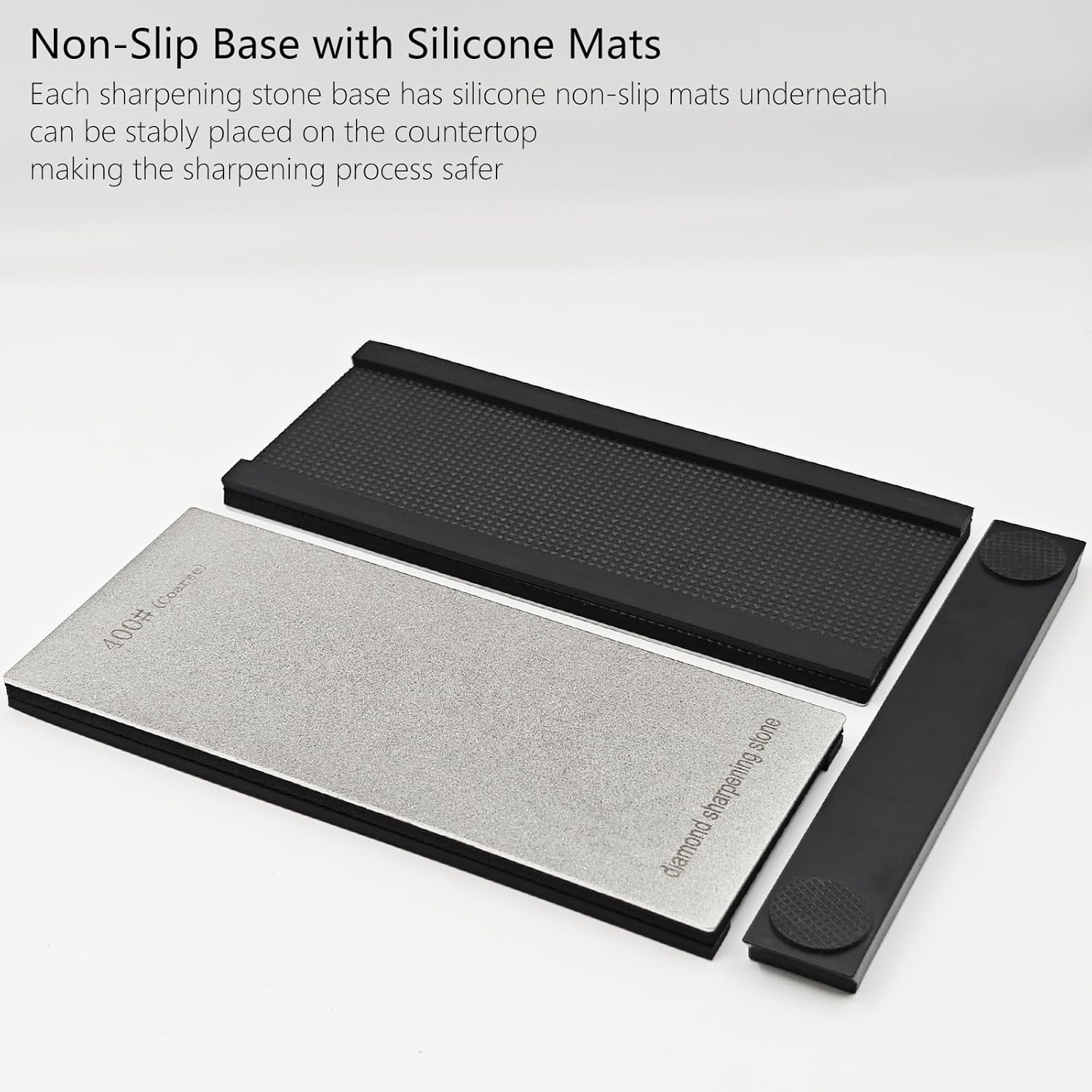 - 【Non-Slip Base with Silicone Mats】Each sharpening stone base has silicone non-slip mats underneath, can be stably placed on the countertop, making the sharpening process safer
