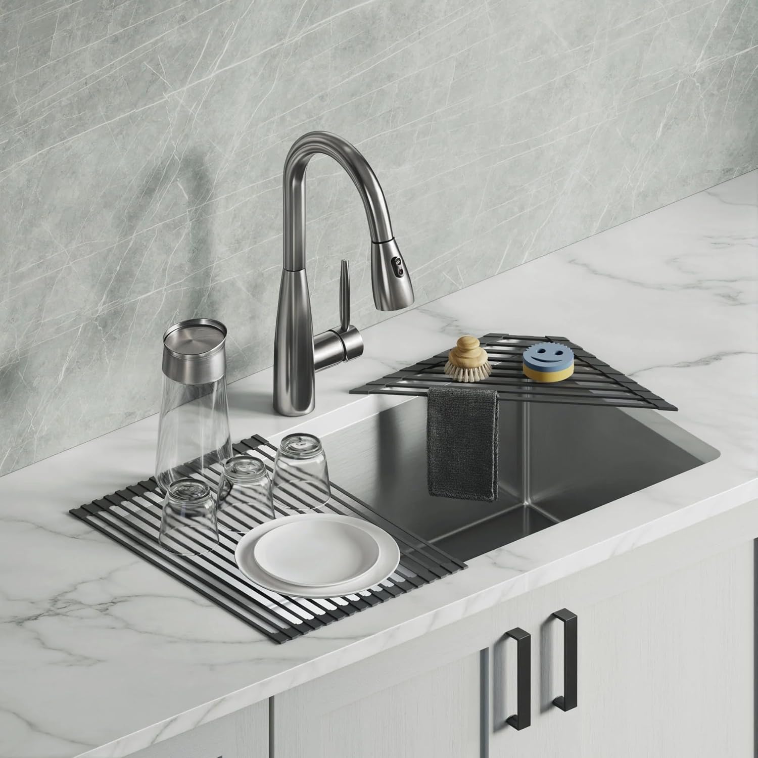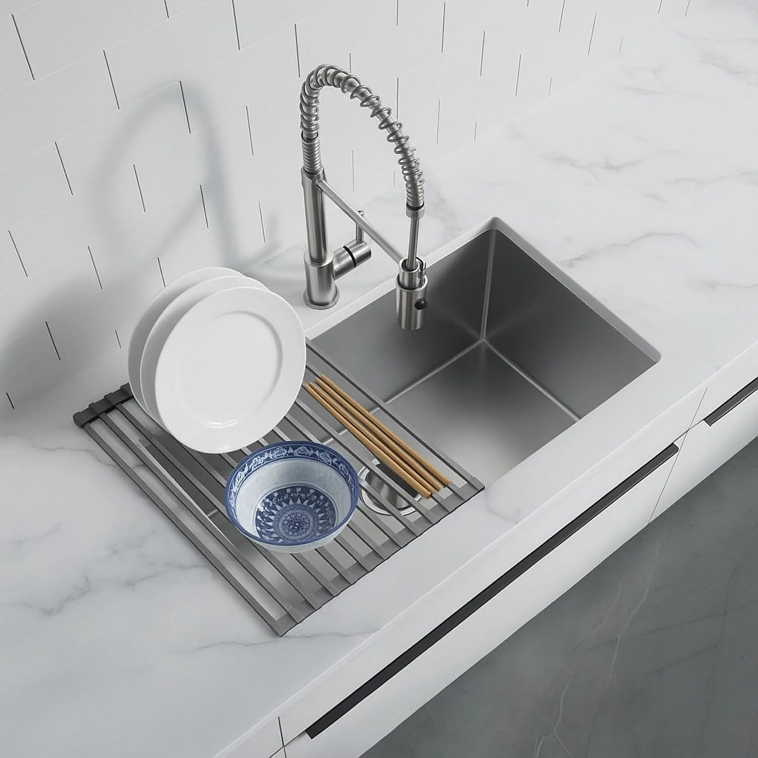 - Fits on Any Surface & Sleek Looks: Designed to stretch over sinks or lay flat on countertops, offering flexibility wherever needed. Smooth silicone finish delivers a modern look that blends seamlessly with any kitchen décor.